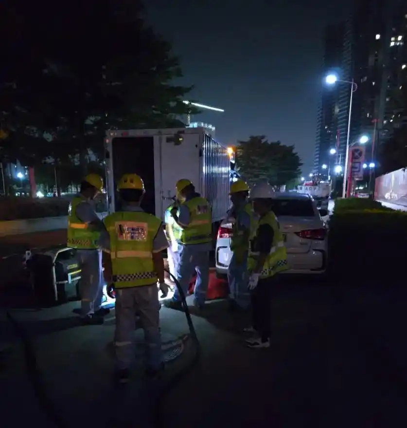 作为广州市“菜篮子”工程和“攻城拔寨”项目,黄沙水产中心的顺利运营关乎民生保障和城市功能延续。排水公司抽调精干力量,组成特别工作专班,配备1台大流量泵车、2台动力站、450米水带等专业设备,启动“白+黑”24小时不间断导水作业模式。