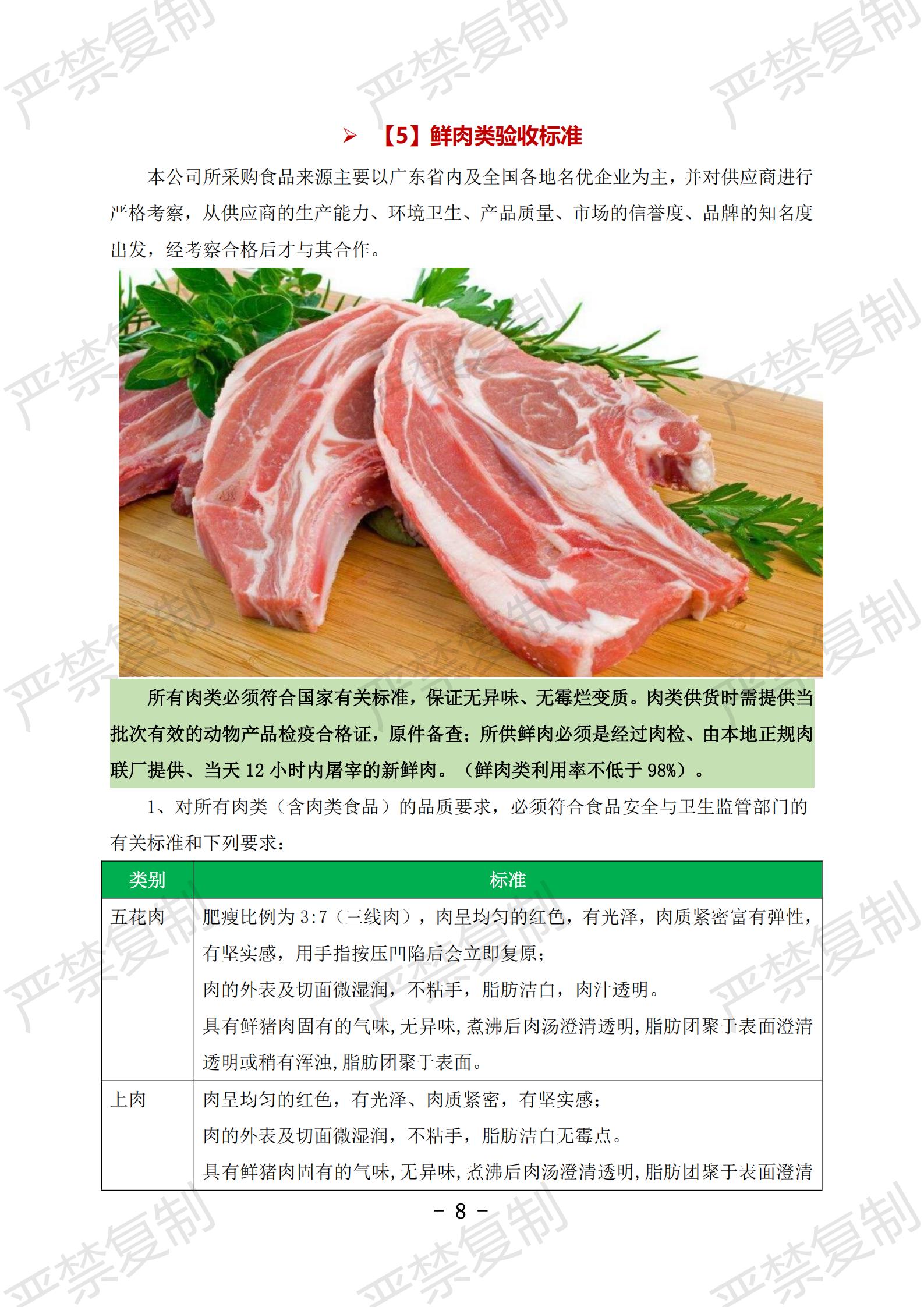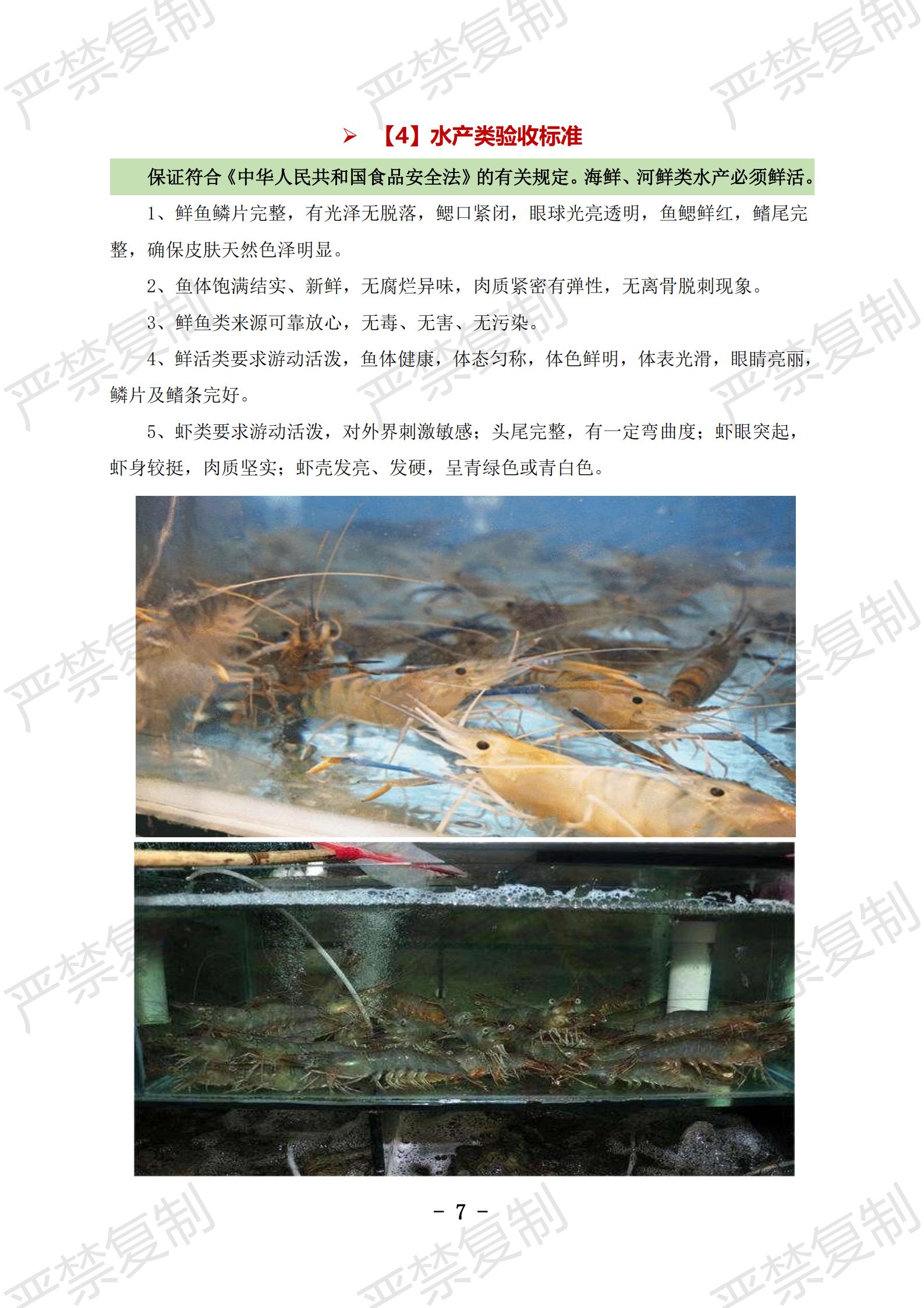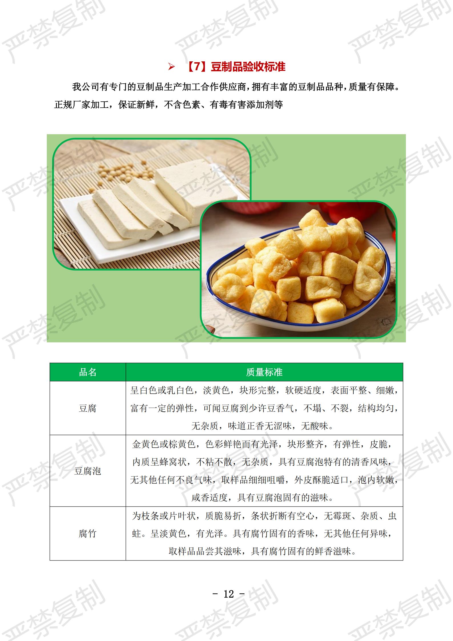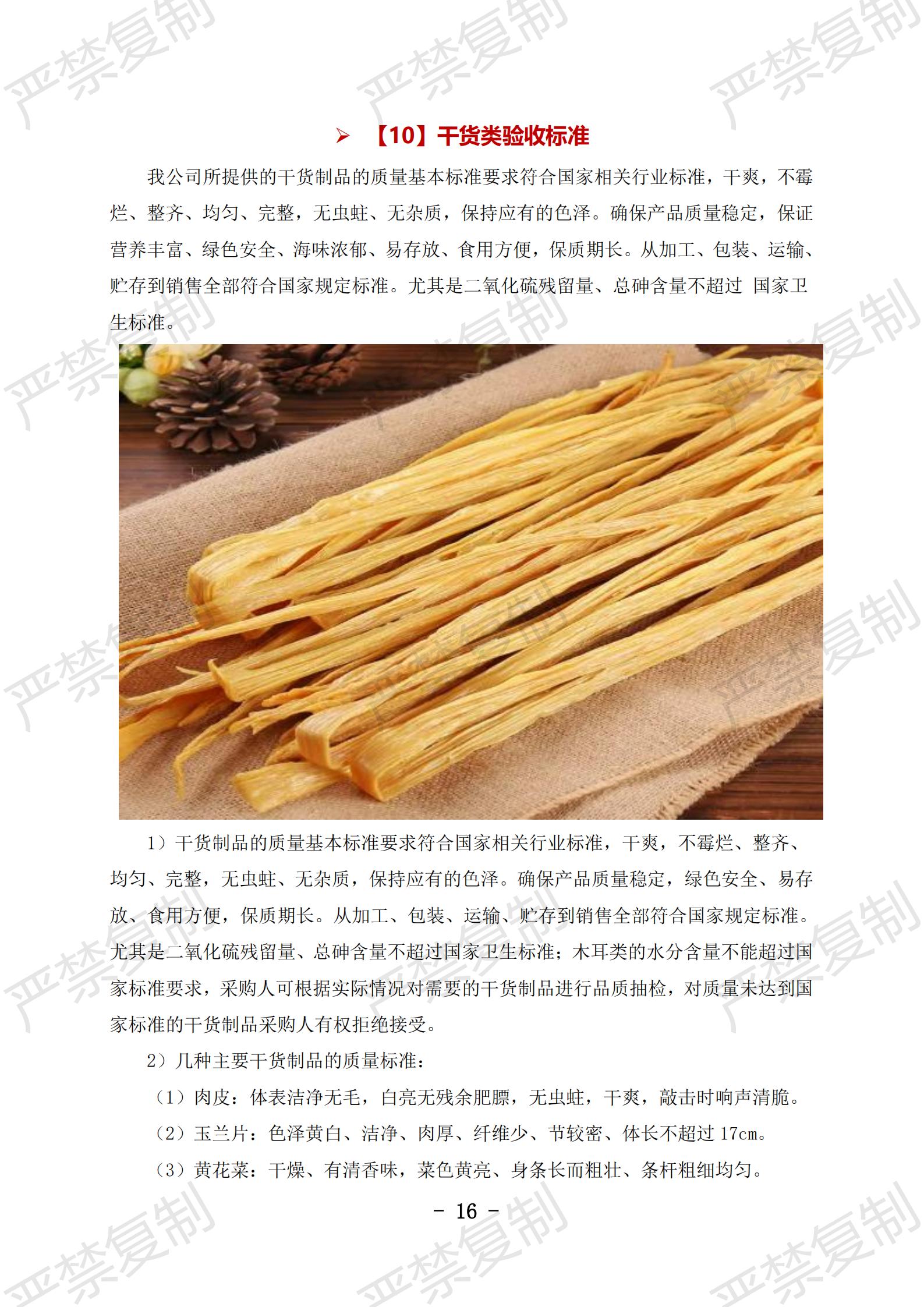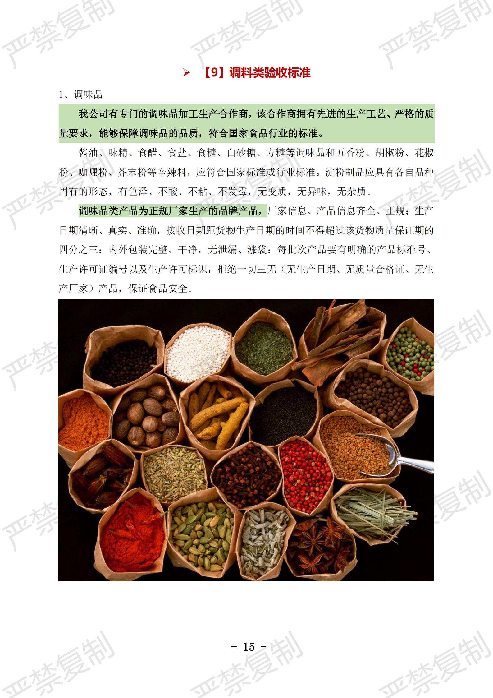 蔬果类验收标准;水果类验收标准;冷冻类验收标准;水产类验收标准;鲜肉类验收标准;蛋类验收标准;豆制品验收标准;粮油类验收标准;调料类验收标准;干货类验收标准