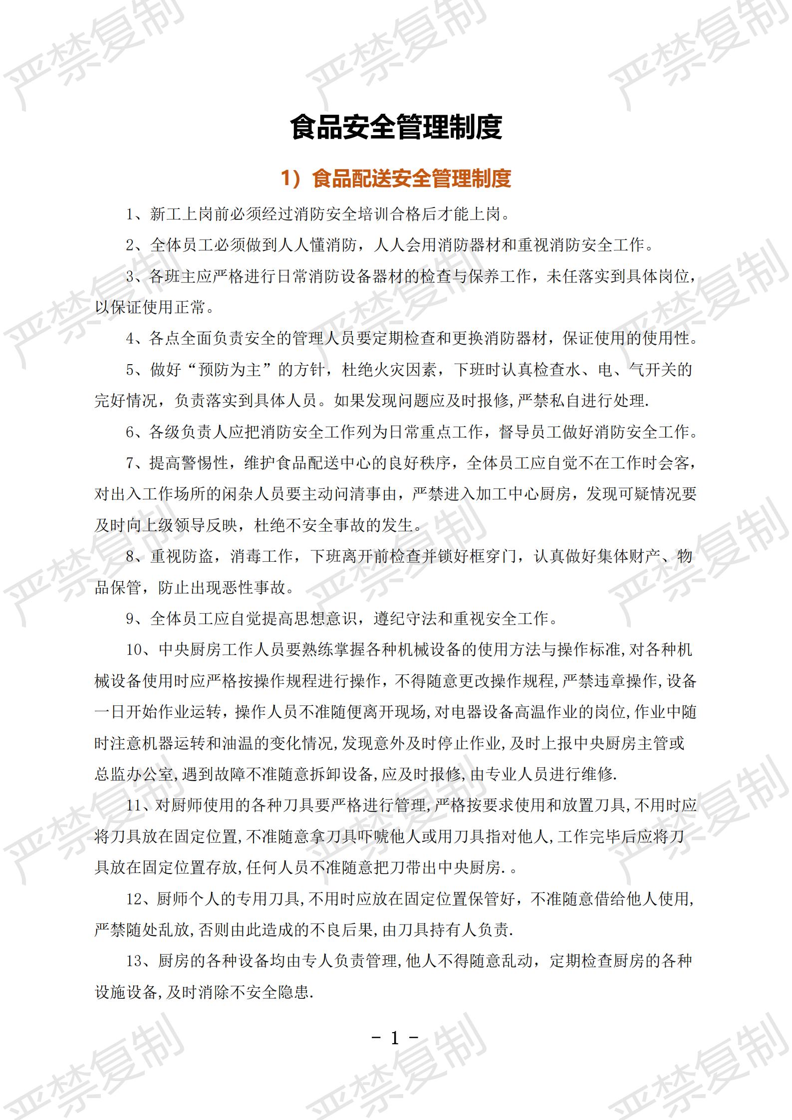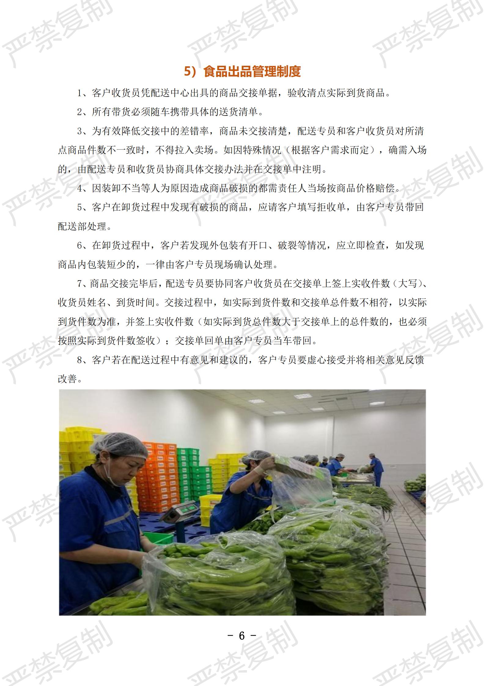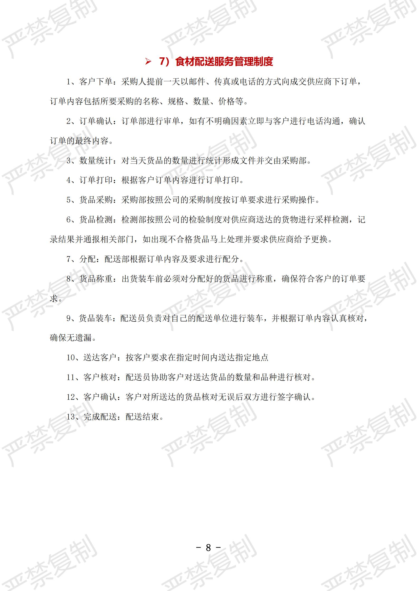 1)食品配送安全管理制度;2)食品采购管理制度;3)食材验收管理制度;4)食品入库管理制度;5)食品出品管理制度;6)食材货物盘点制度;7)食材配送服务管理制度;8)食品安全运送制度;9)食品运输管理制度;10)配送人员管理制度;11)质量投诉处理制度;