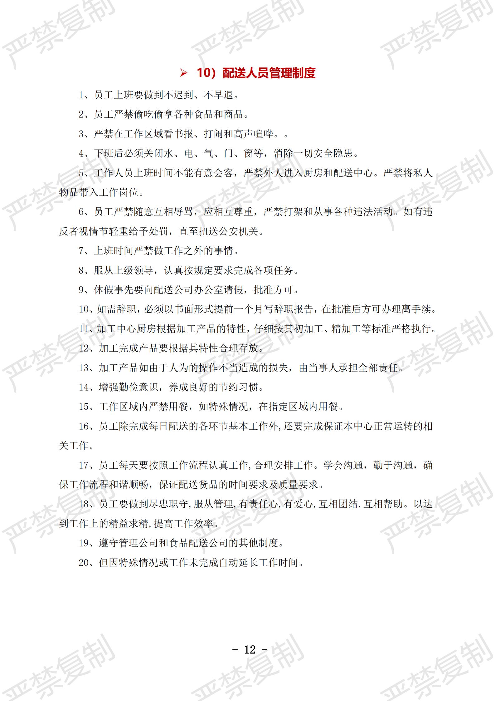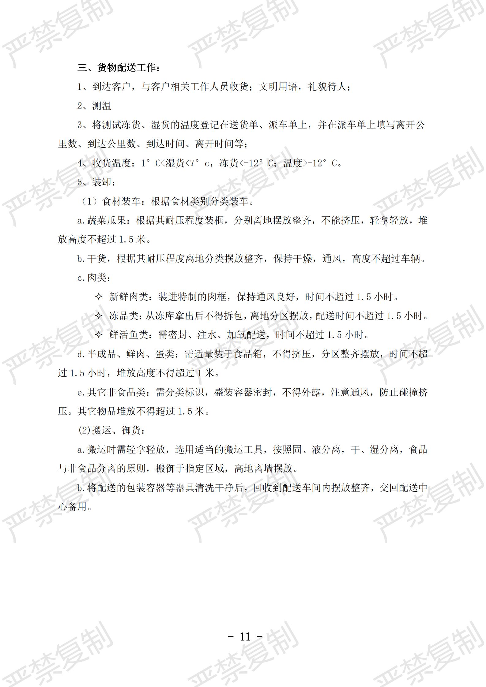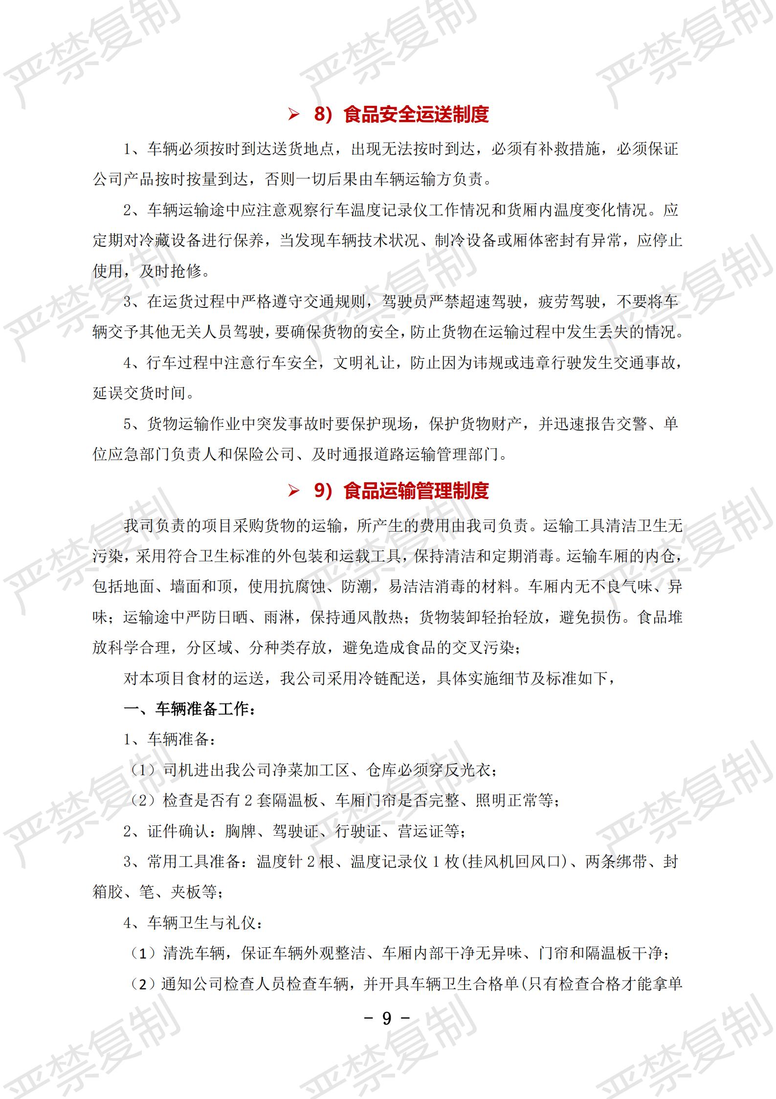 1)食品配送安全管理制度;2)食品采购管理制度;3)食材验收管理制度;4)食品入库管理制度;5)食品出品管理制度;6)食材货物盘点制度;7)食材配送服务管理制度;8)食品安全运送制度;9)食品运输管理制度;10)配送人员管理制度;11)质量投诉处理制度;